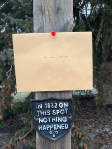 Based on requests so far, I have typed and mailed three letters. Three more were posted in the neighbourhood yesterday…and all three were taken. One person kindly left the pushpin for the next note.