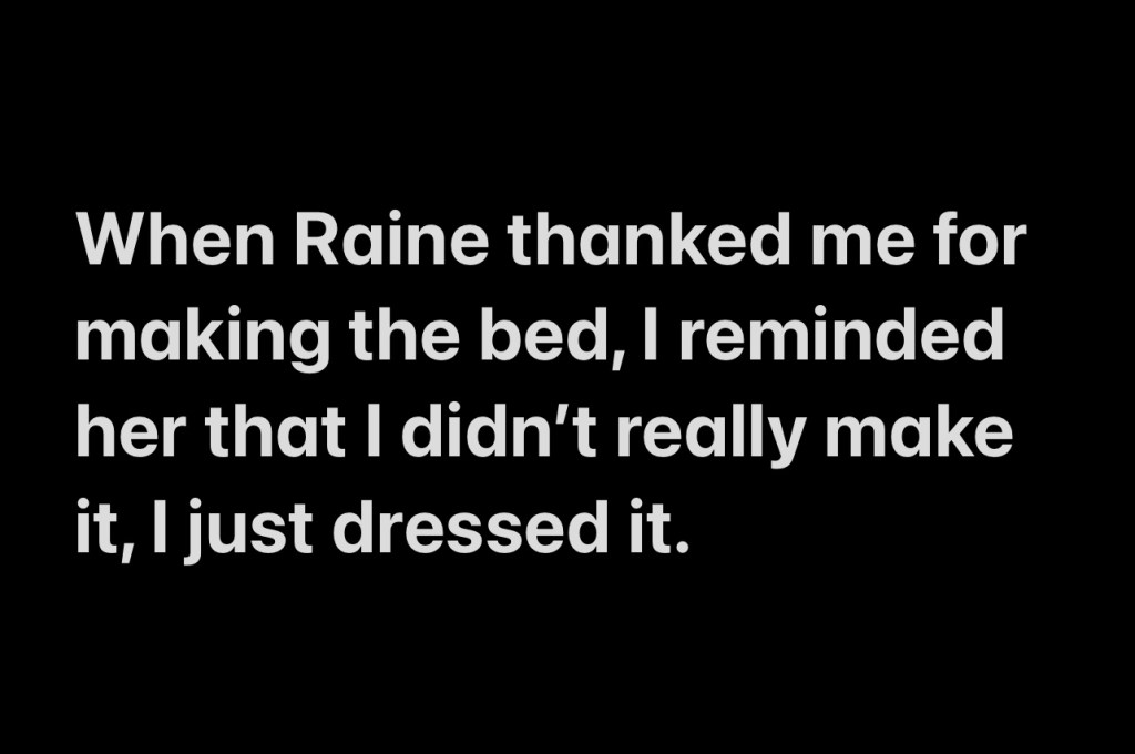 When Raine thanked me for making the bed, I reminded her that I didn’t really make it, I just dressed it.