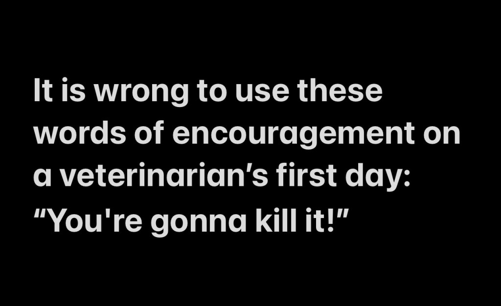 It is wrong to use these words of encouragement on a veterinarians first day: