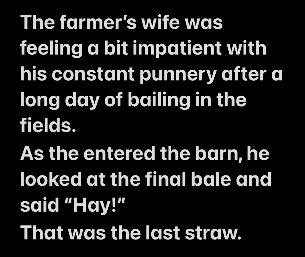 The farmer’s wife was feeling a bit impatient with his constant punnery after a long day of bailing in the fields.