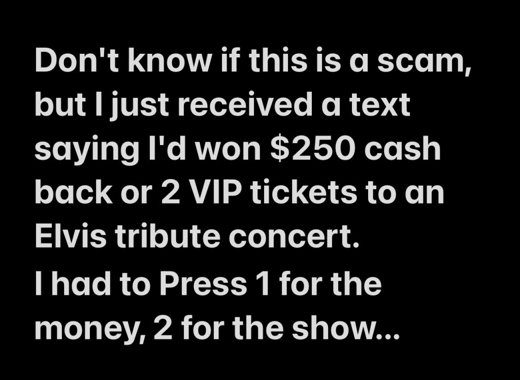 Don’t know if this is a scam, but I just received a text saying I’d won $250 cash back or 2 VIP tickets to an Elvis tribute concert.