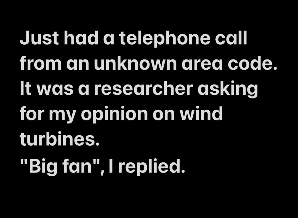 Just had a telephone call from an unknown area code. It was a researcher asking for my opinion on wind turbines.