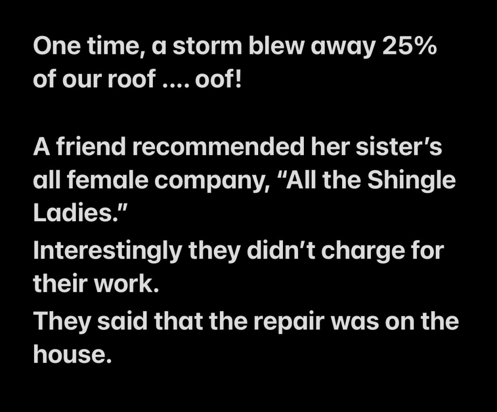 One time, a storm blew away 25% of our roof …. oof!