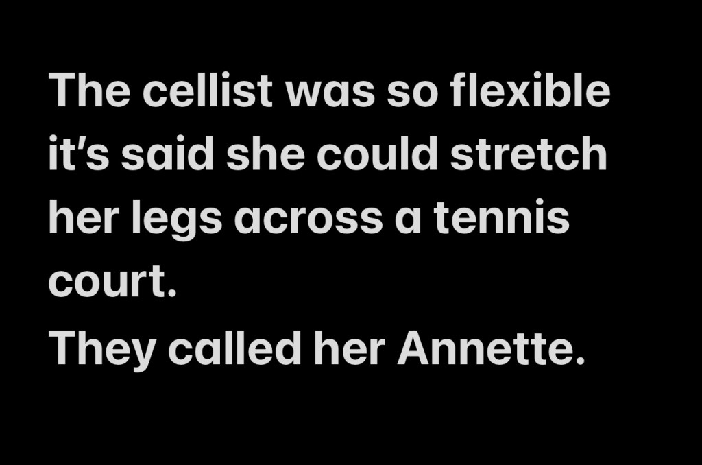 The cellist was so flexible it’s said she could stretch her legs across a tennis court.