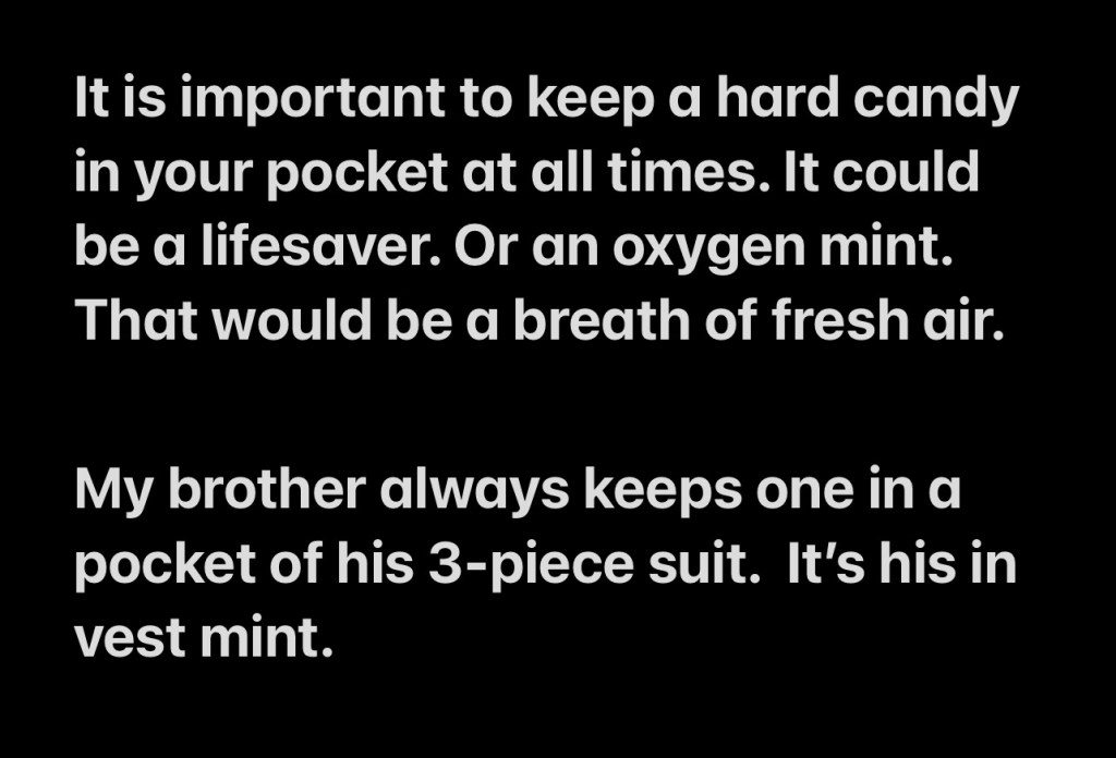 It is important to keep a hard candy in your pocket at all times. It could be a lifesaver. Or an oxygen mint. That would be a breath of fresh air.