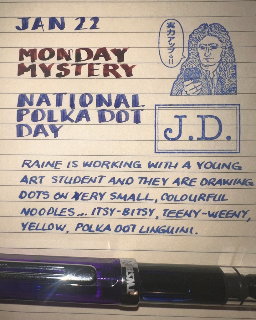 Raine is working with an art student and they are drawing dots on very small, colorful noodles…itsy, bitsy, teeny-weeny, yellow, polka dot linguini.